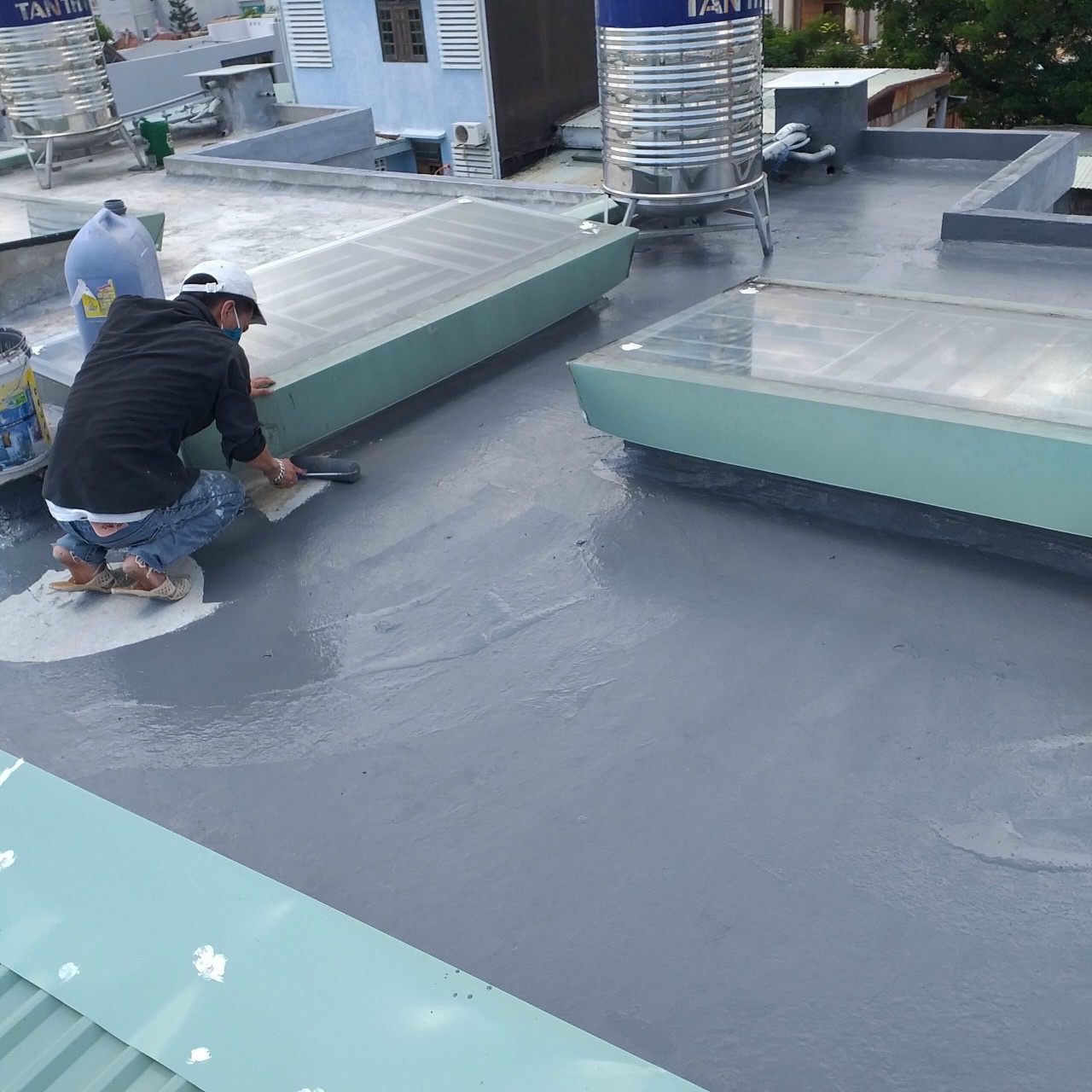 Dùng chổi lông hoặc cọ để sơn lớp sơn chống thấm lên bề mặt cần sửa hoặc bảo vệ. Trong quá trình sơn, bạn nên sử dụng đồ bảo hộ như kính bảo vệ, khẩu trang và găng tay để tránh tiếp xúc trực tiếp với sơn.